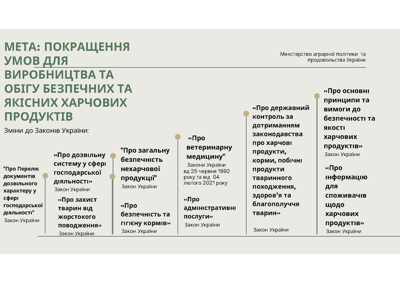 Мета змін – покращити умови для виробництва та обігу безпечних і якісних харчових продуктів та кормів для тварин, вдосконалити систему забезпечення благополуччя тварин. Для цього необхідно буде внести зміни до 10-ти Законів України, які регулюють згадані сфери.