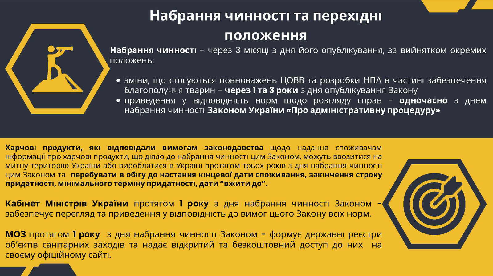 Закон набирає чинності через три місяці з дня опублікування, крім окремих його положень, щодо яких передбачено перехідні періоди.