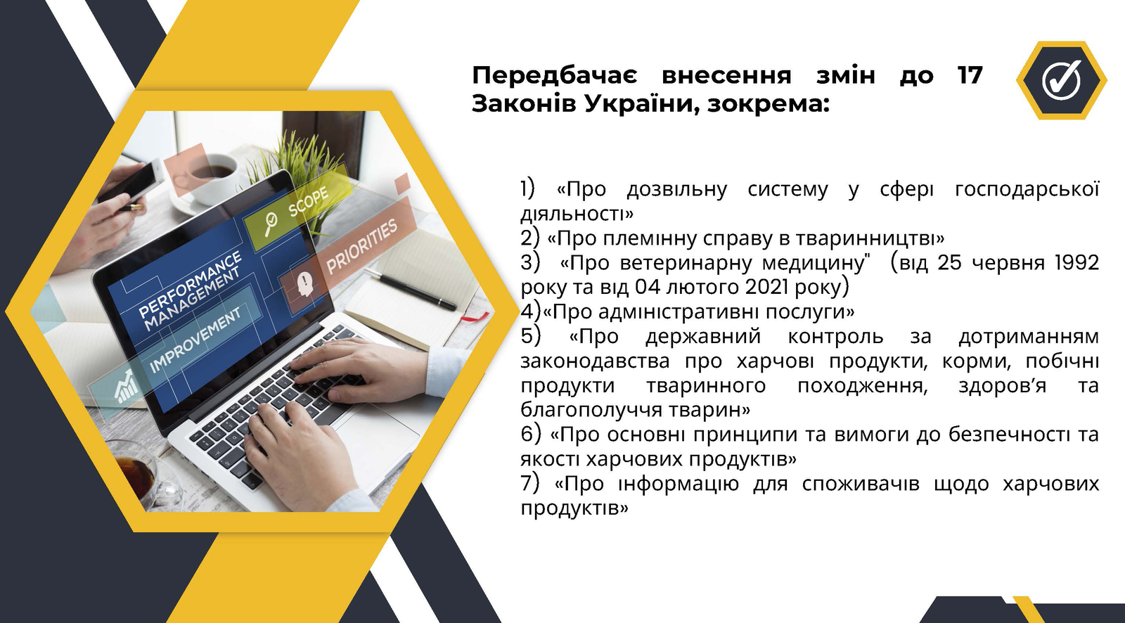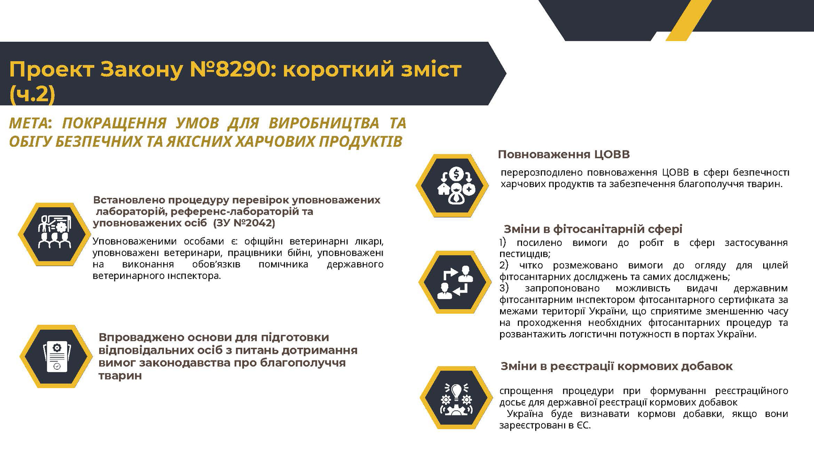 «Законопроект допоможе покращити умови для виробництва та обігу безпечних і якісних харчових продуктів та кормів для тварин, вдосконалити систему забезпечення благополуччя тварин, забезпечить високий рівень захисту здоров’я громадян і задоволення їхніх соціальних та економічних інтересів. Окрім того, норми документу максимально наближені до стандартів ЄС».