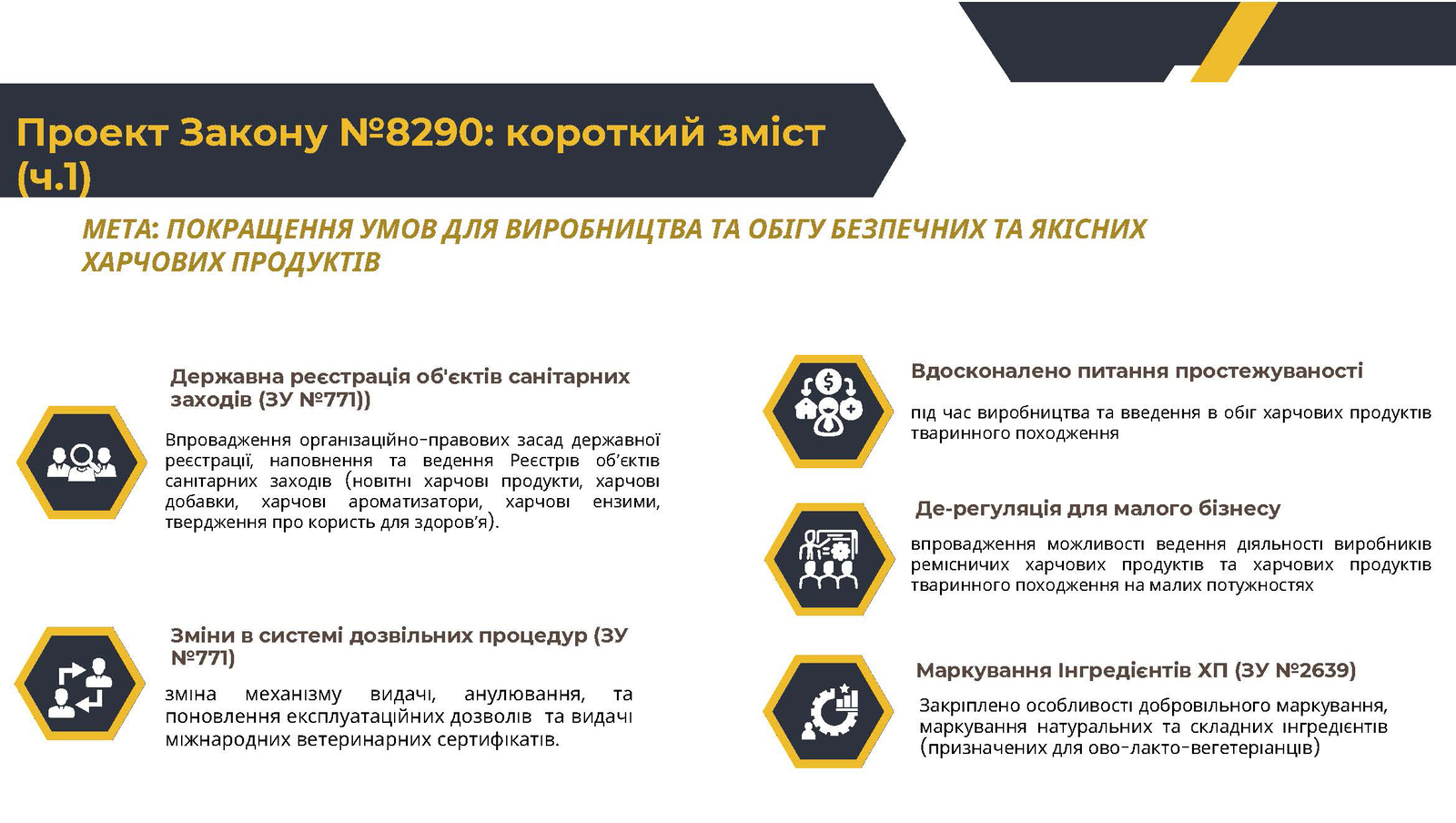 - спрощення визнання особливостей державної реєстрації виробників ремісничих харчових продуктів та харчових продуктів тваринного походження на малих потужностях з виробництва харчових продуктів тваринного походження;