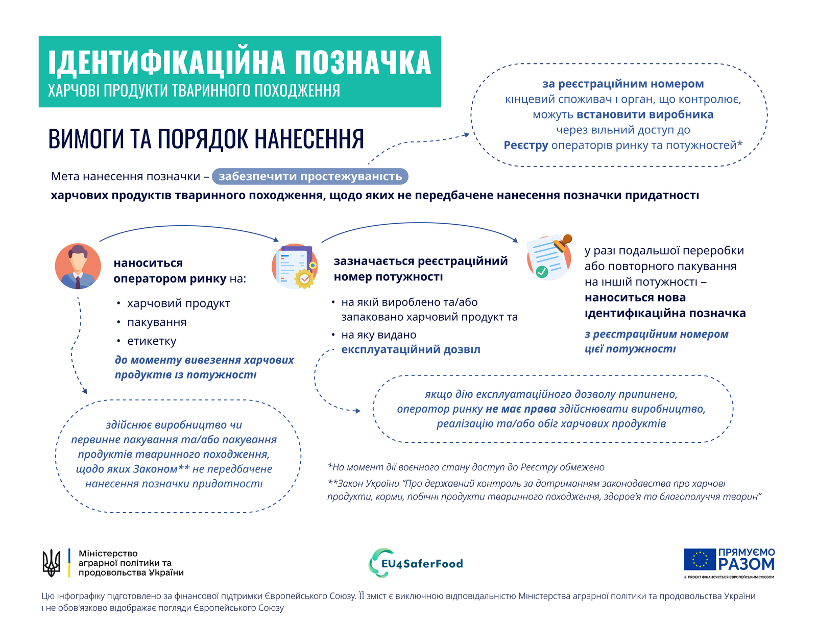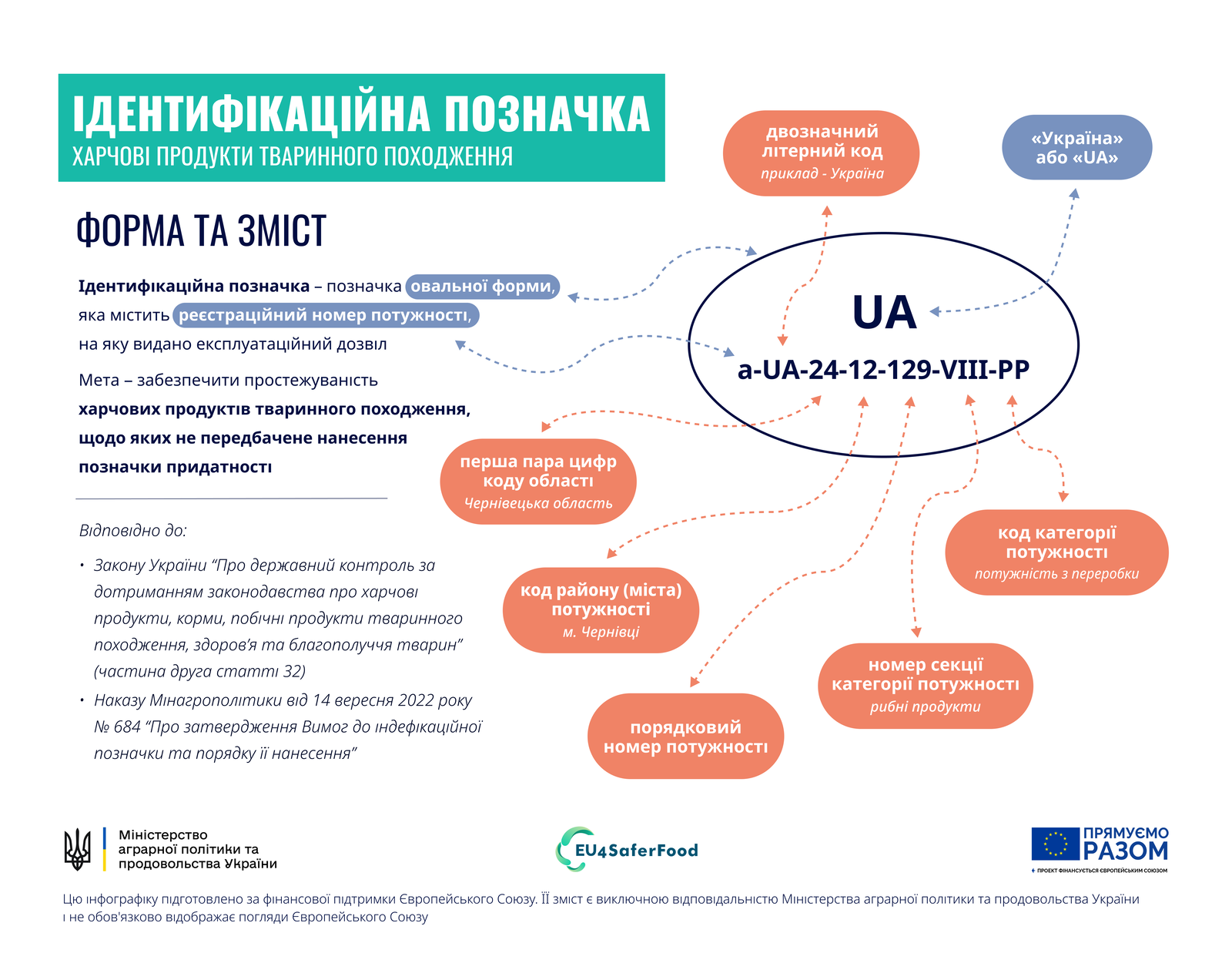 Ідентифікаційна позначка має бути нанесена безпосередньо на харчовий продукт тваринного походження, його первинне пакування чи пакування, або на етикетку, що приєднується до такого продукту, до моменту вивезення з потужності. Вона має містити написи, які складаються зі слів “УКРАЇНА” або “UA” і реєстраційного номеру потужності, що присвоюється потужності, на яку видано експлуатаційний дозвіл.