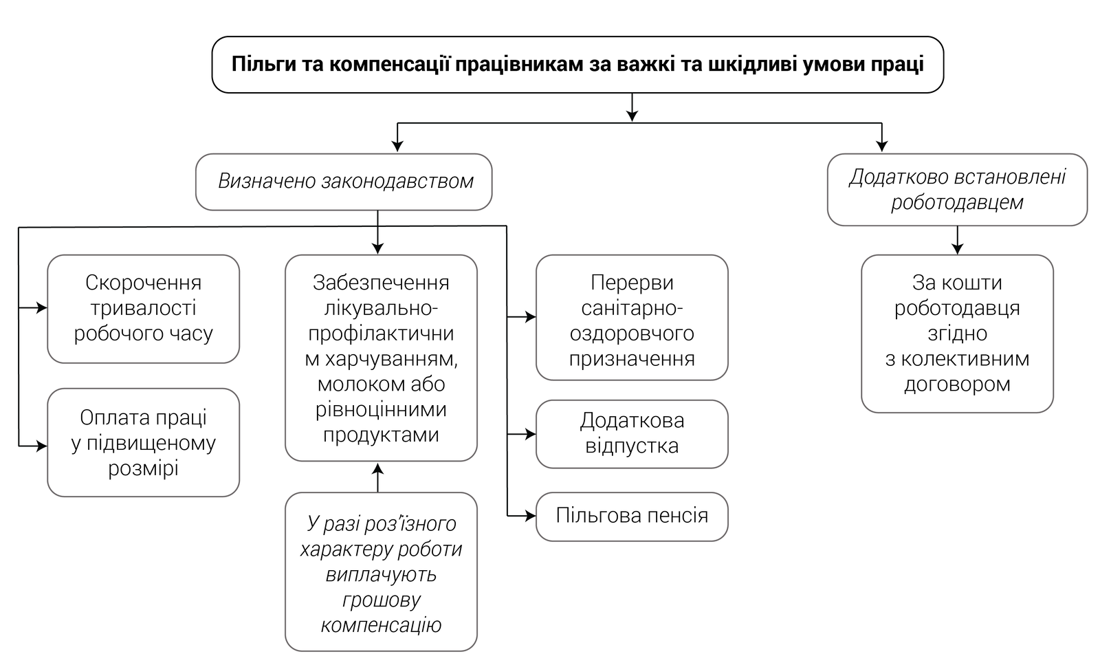 Пільги і компенсації працівникам за важкі та шкідливі умови праці наведено на рисунку.