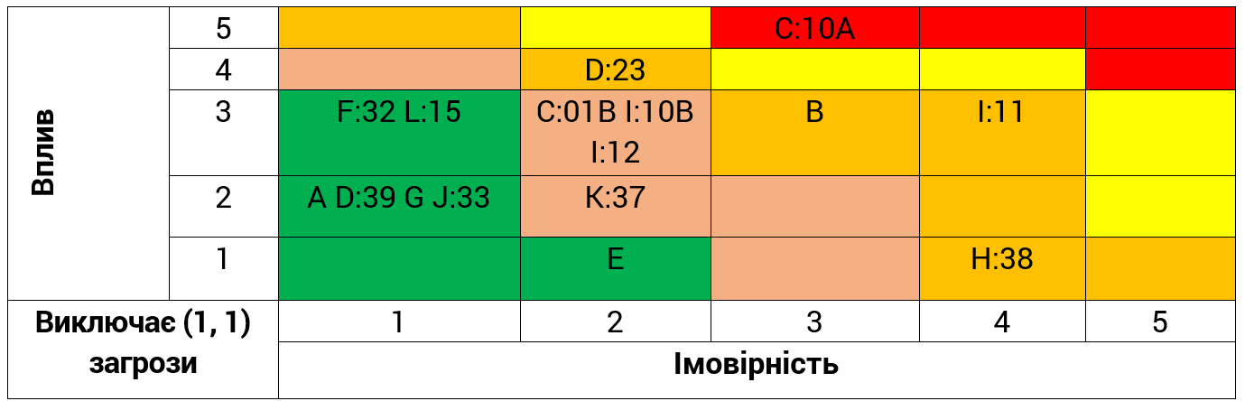 У таблицях 1 – 3 наведена інформація про загрози, їхня ідентифікація та оцінка, а рисунок 1 демонструє пріоритизацію загроз.